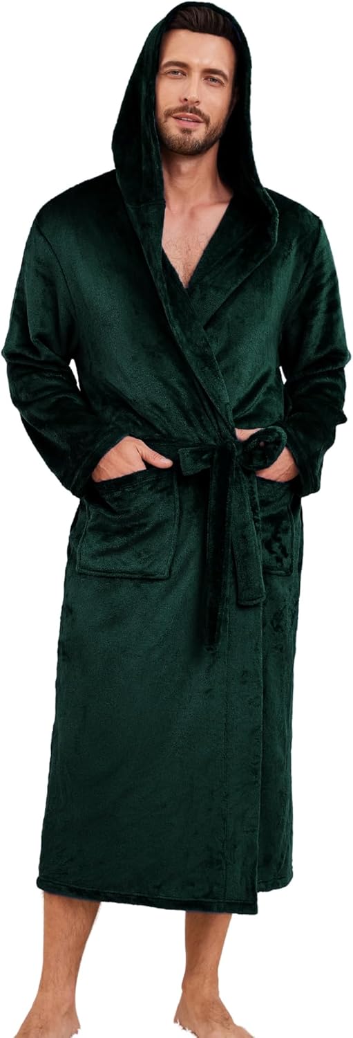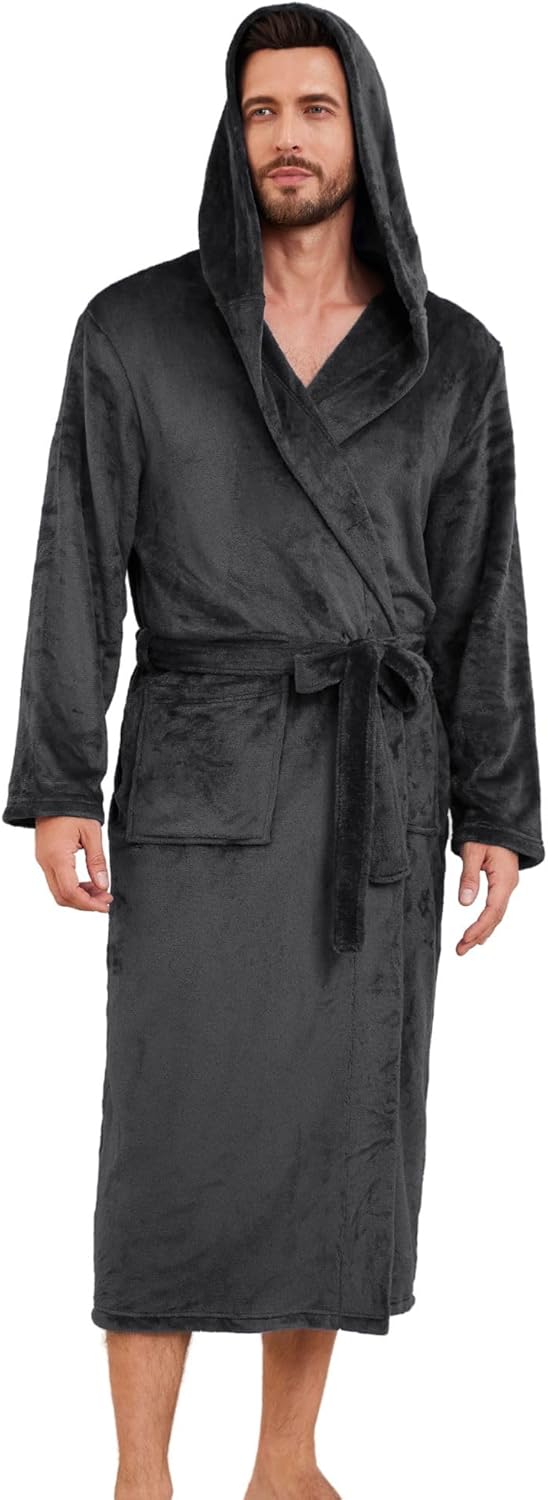EK4YDNDS Mens Hooded Fleece Robe, Lightweight Soft Warm Fleece Bathrobe Shower Spa Long Robe With Pockets