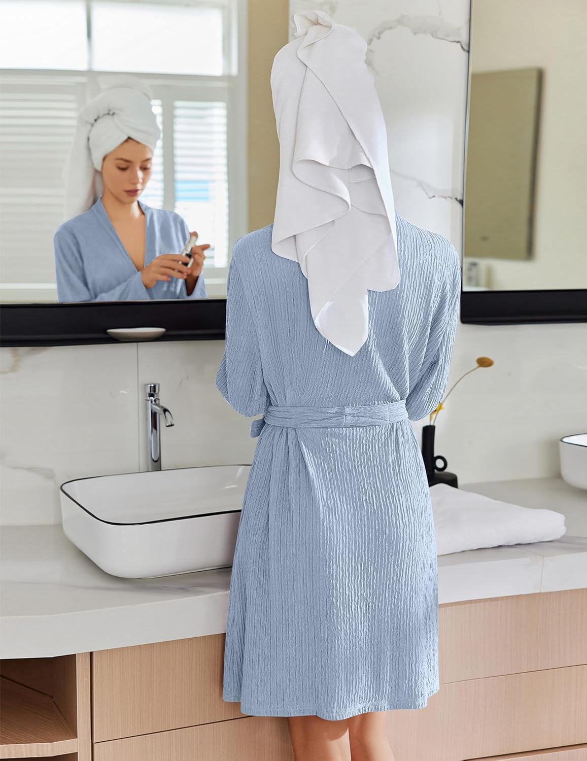 The tie-up design allows for easy on and off, making it perfect as a shower or morning dressing robe.