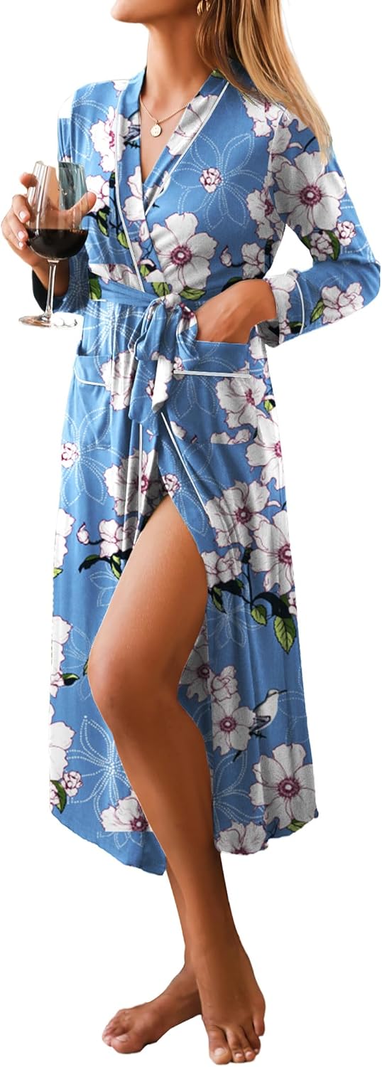 Ekouaer Women Kimono Robes Full Length Knit Bathrobe Lightweight Soft Sleepwear V-neck Casual Ladies Loungewear S-XXL