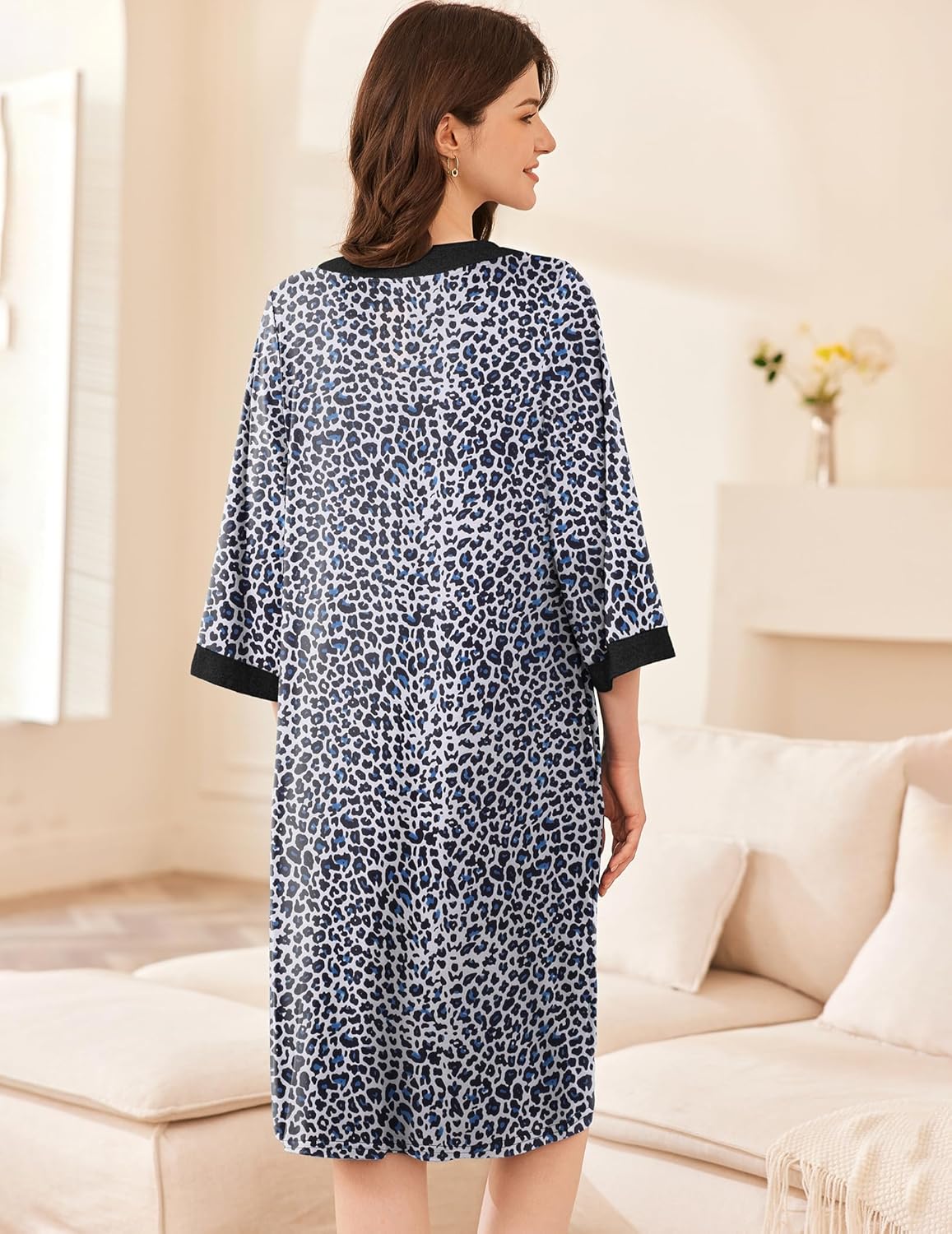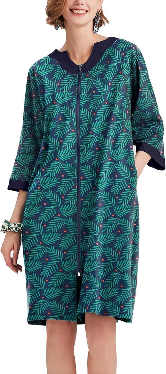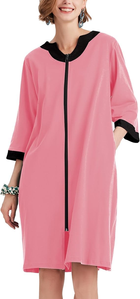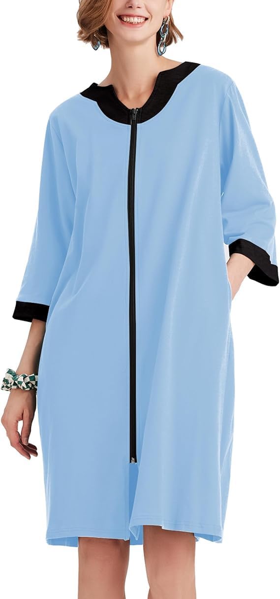 Ekouaer Women Zipper Robe 3/4 Sleeve Nightgowns Lightweight Short Bathrobe with Pockets S-3XL