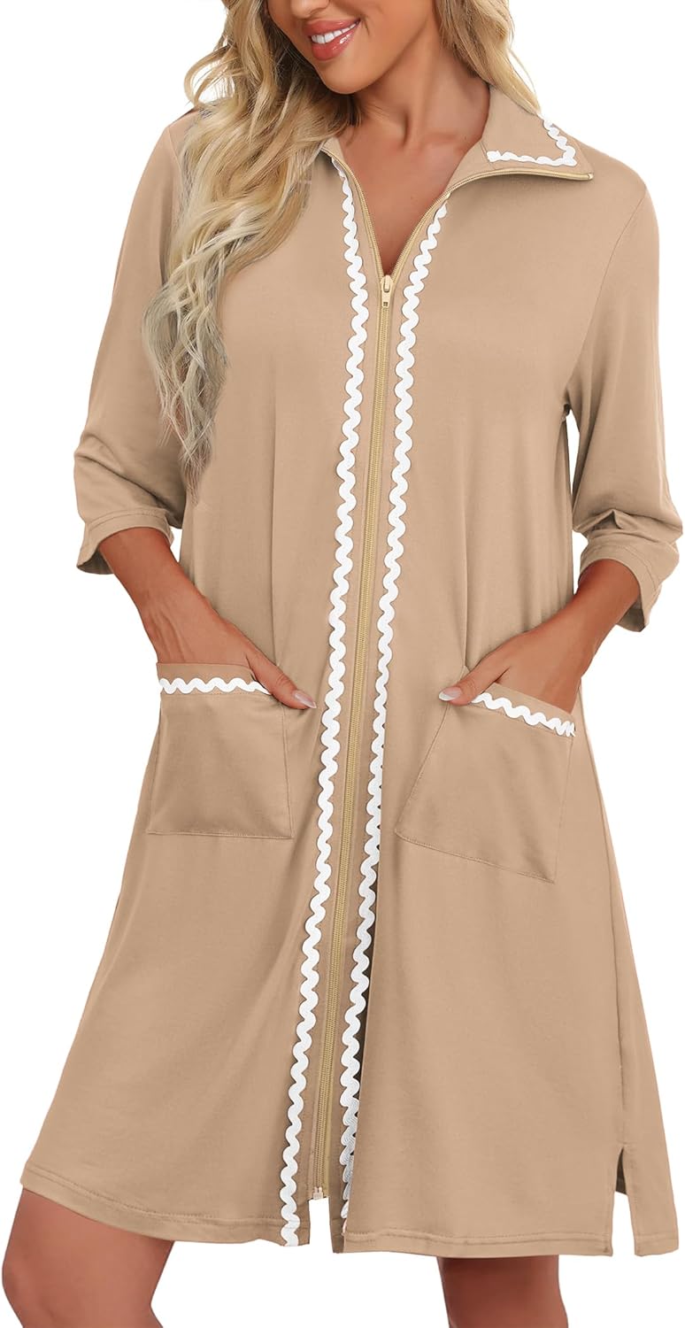 Ekouaer Women Zipper Robe Lightweight House Coat Zipper Front Short Bathrobes Soft Nightgown with Pockets S-3XL