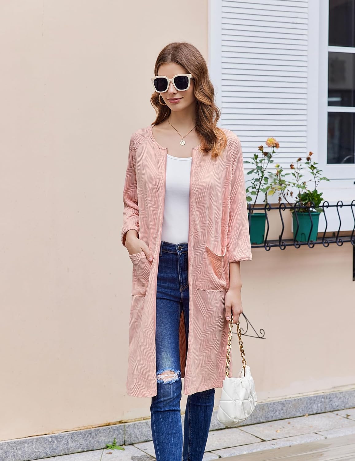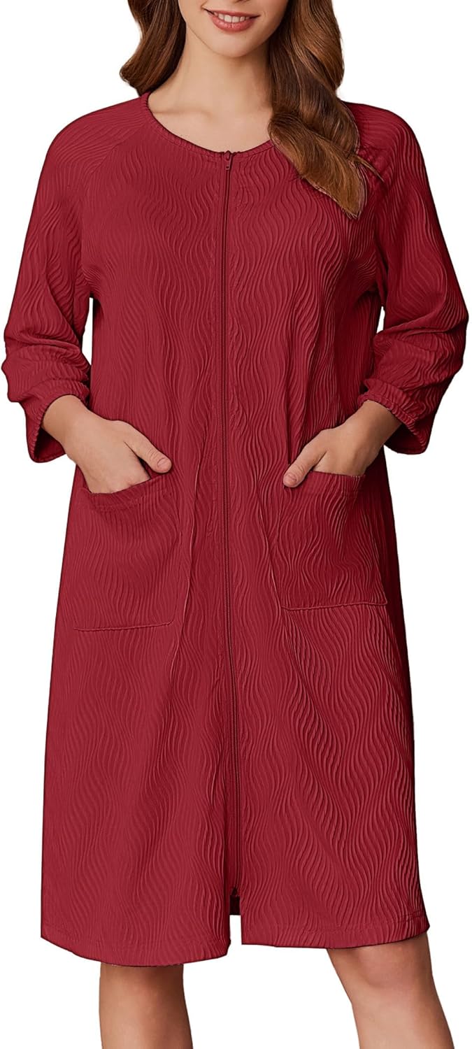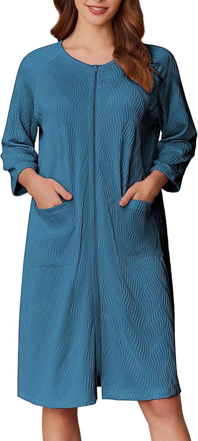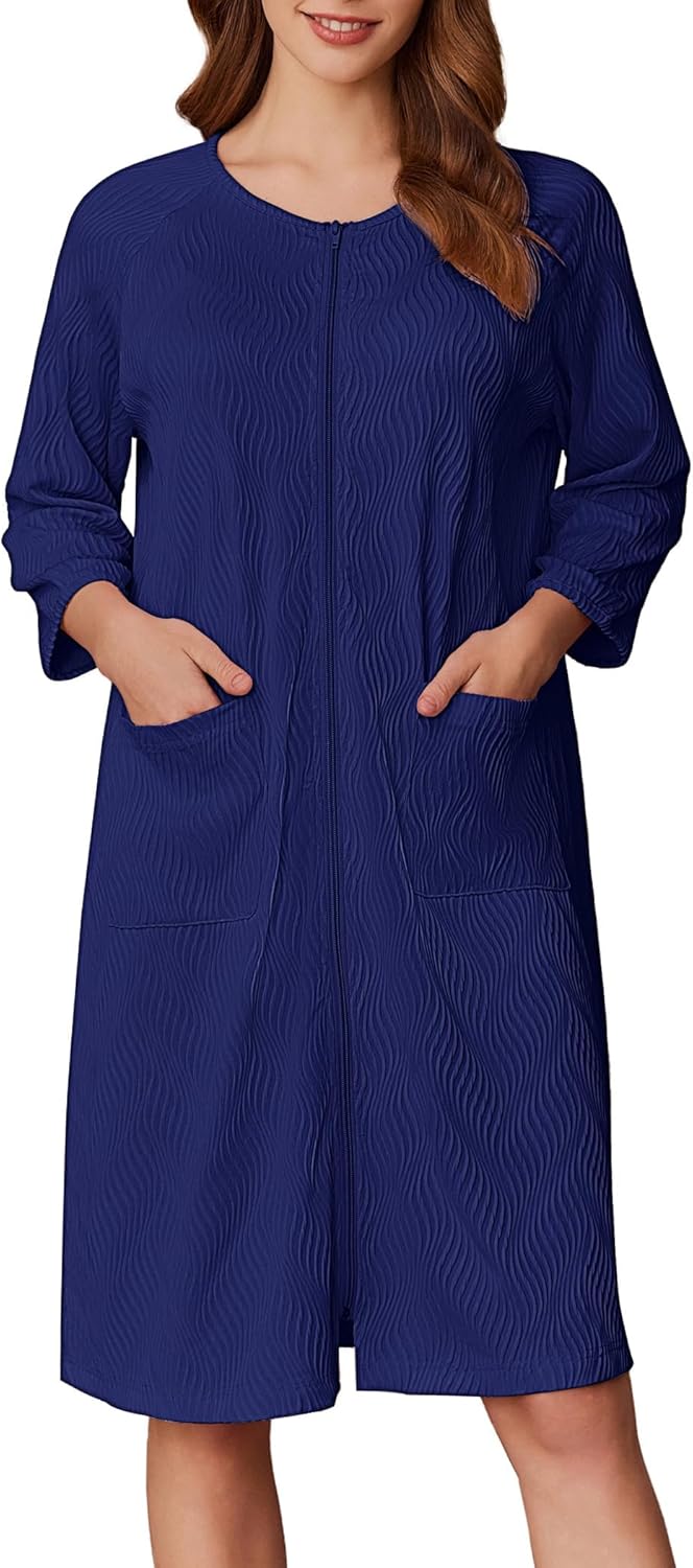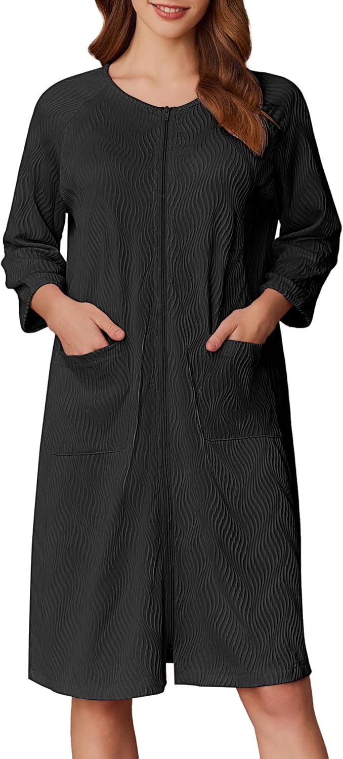 Ekouaer Women Zipper Robes 3/4 Sleeve Ribbed Knit Bathrobe Lightweight Knee Length Loungewear Housecoat with Pockets S-3XL