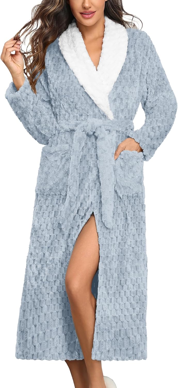 Ekouaer Women’s Robe Long Plush Soft Bathrobe Jacquard Color Block Robes Shawl Collar Sleepwear with Pockets S-XXL