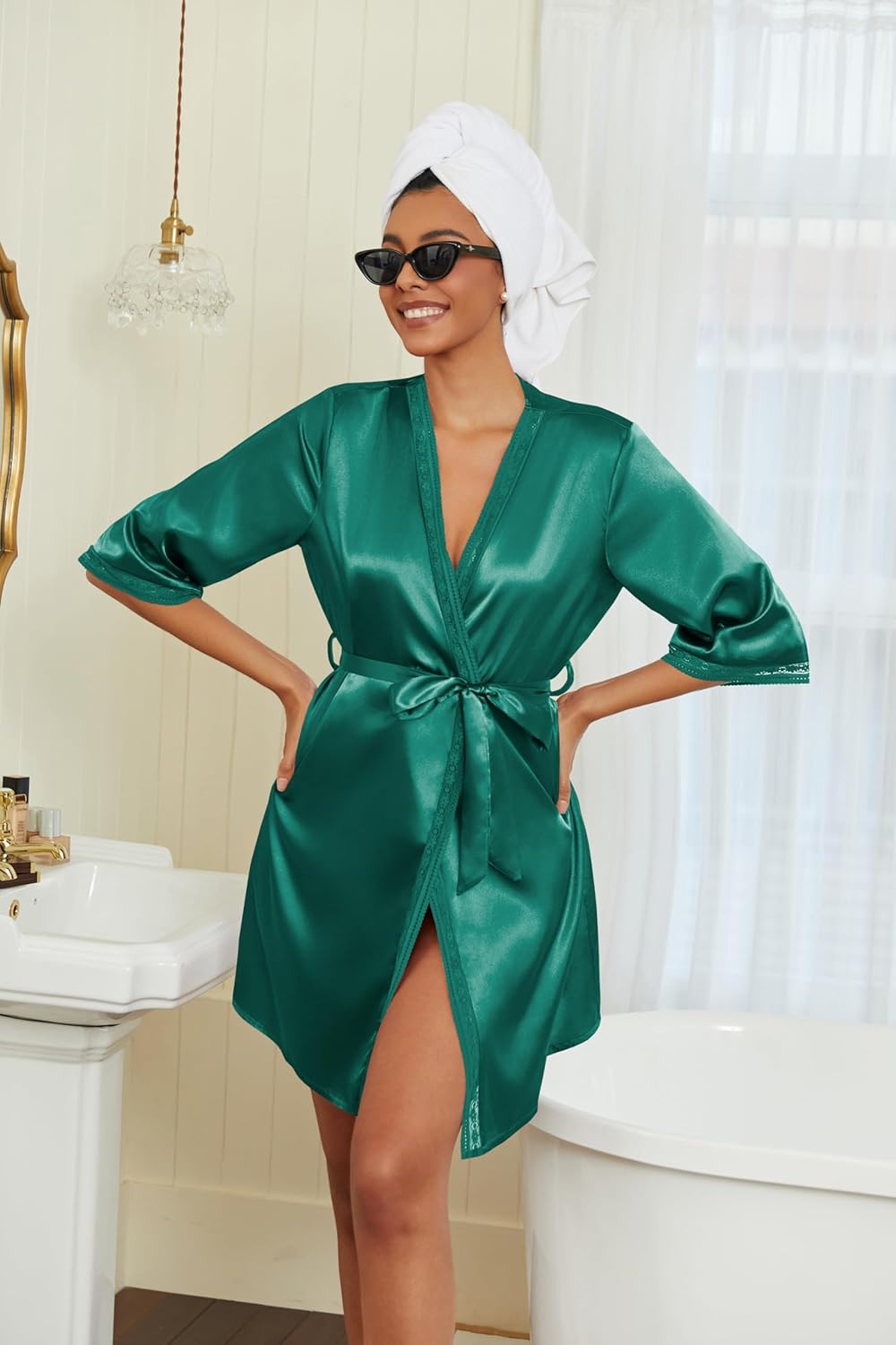 Ekouaer Women’s Satin Robes 3/4 Sleeve Silk Robes Short Kimono Sexy Bride Bathrobes Lace Trim Loungewear with Pockets
