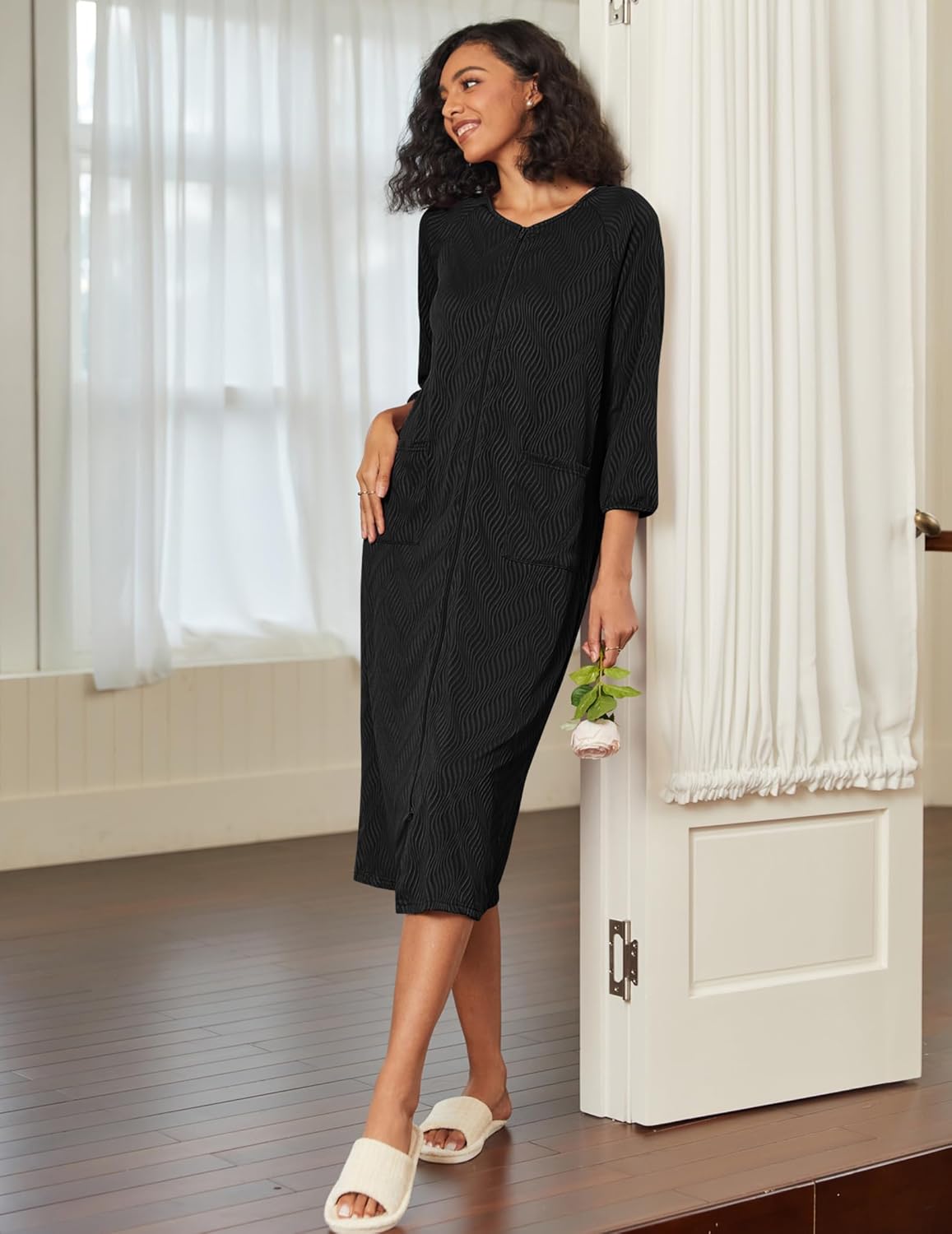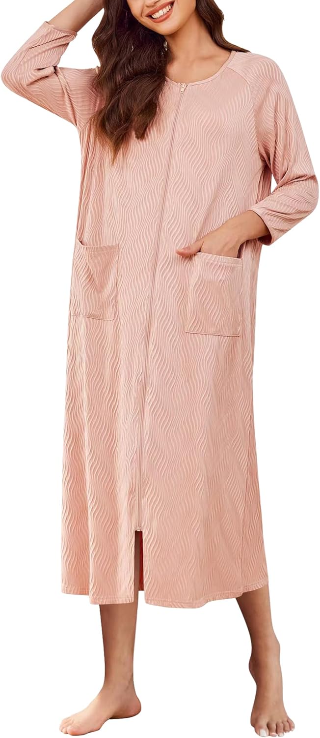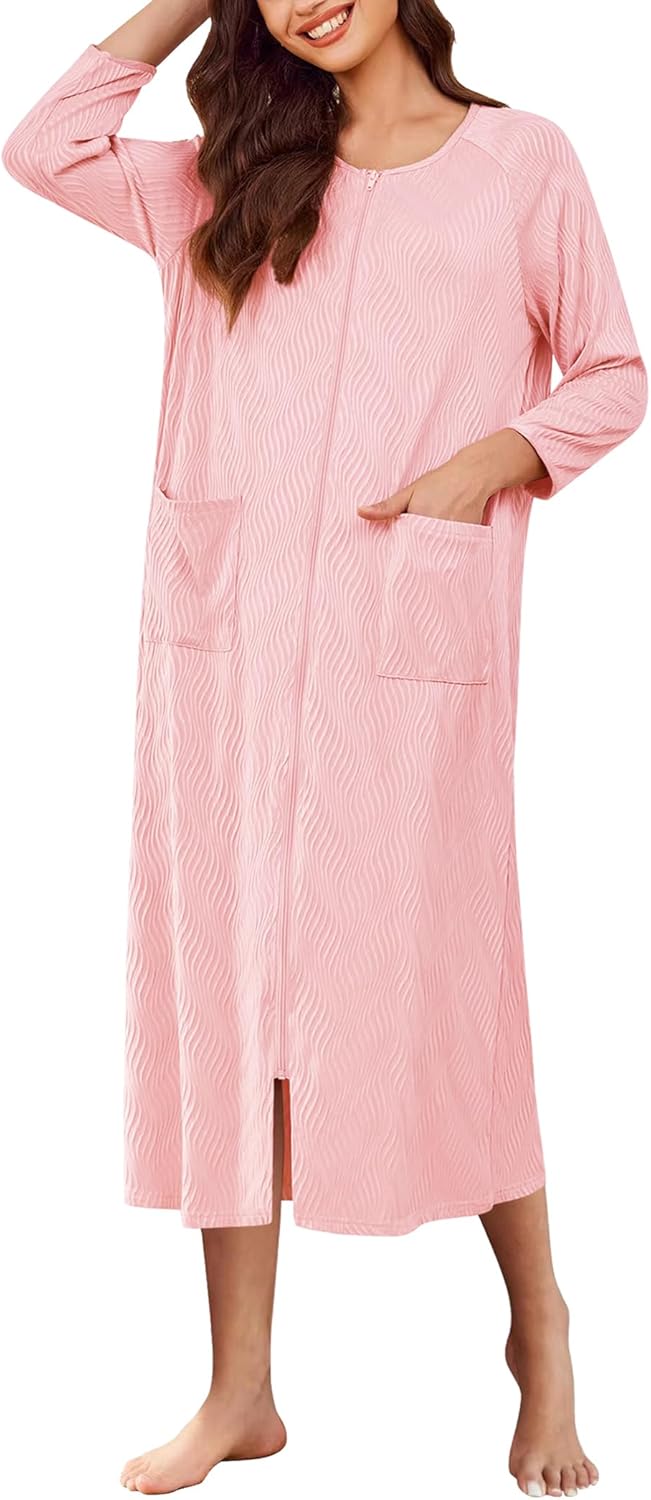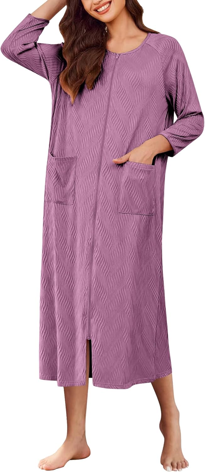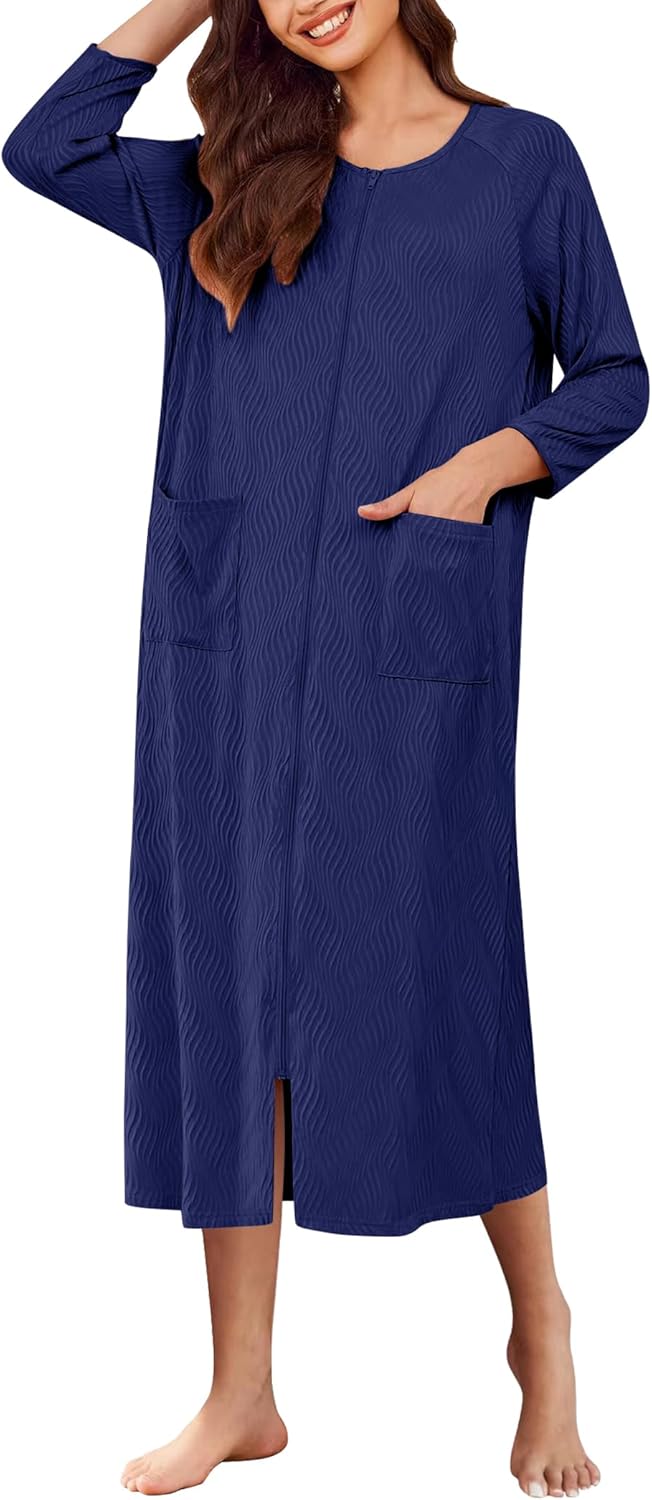 Ekouaer Women Zipper Robes 3/4 Sleeve Ribbed Knit Bathrobe Full Length