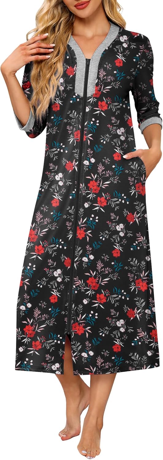 Ekouaer Women’s Zipper Robe 3/4 Sleeves Housecoat Full Length Nightgown Soft Loungewear Robe with Pockets S-3XL