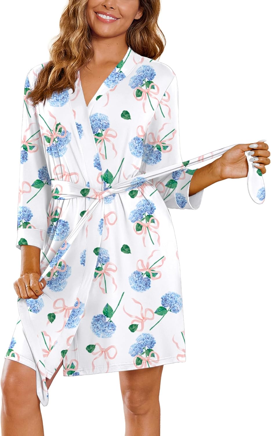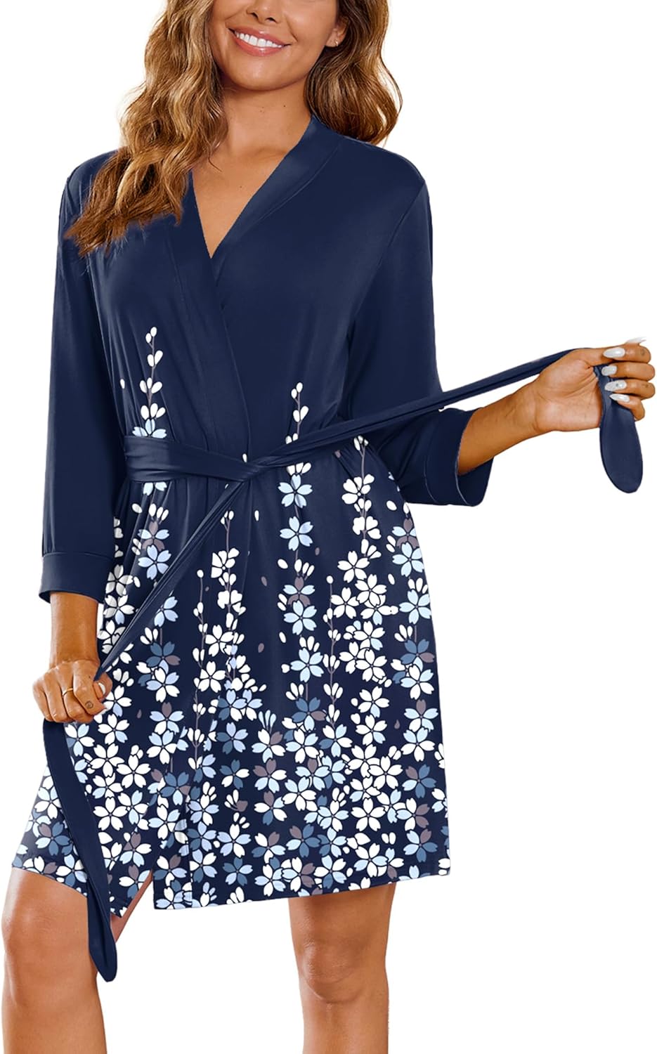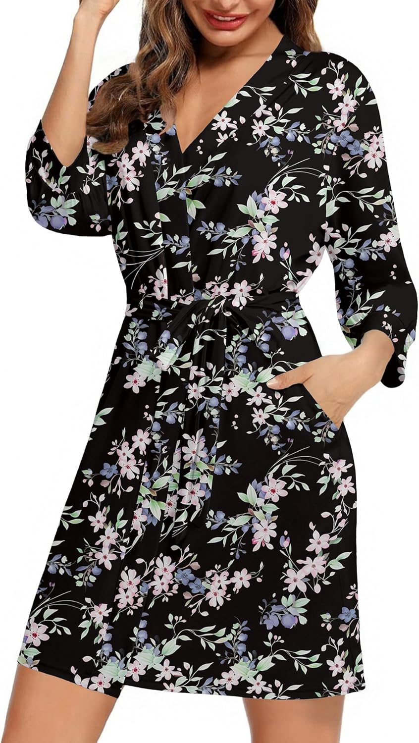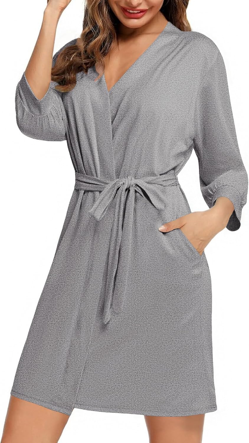Ekouaer Womenu2018s Robes Lightweight 3/4 Sleeve Short Knit Bathrobe Soft Knee Length Sleepwear Robes with Pockets S-XXL