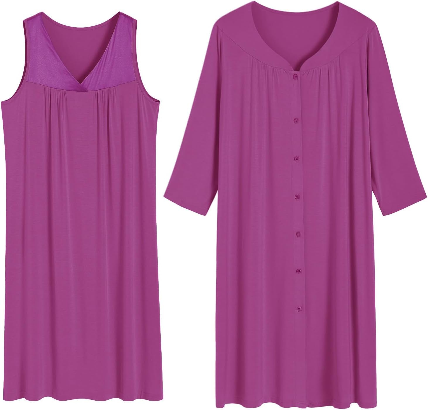 - Breathable sleeveless pajama gown is cool for summer days. Matching 3/4 sleeve duster robe is warm for chill nights and decent for lounging around the house.