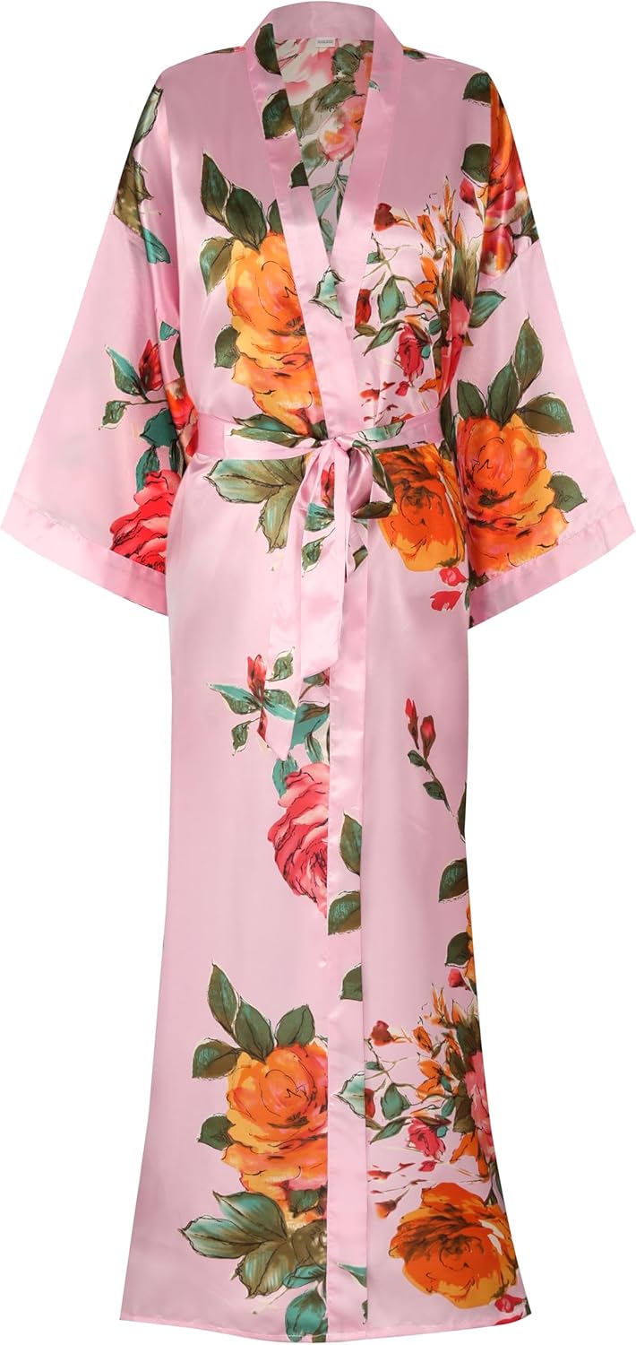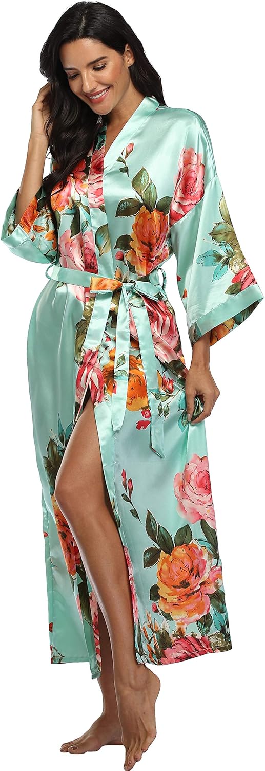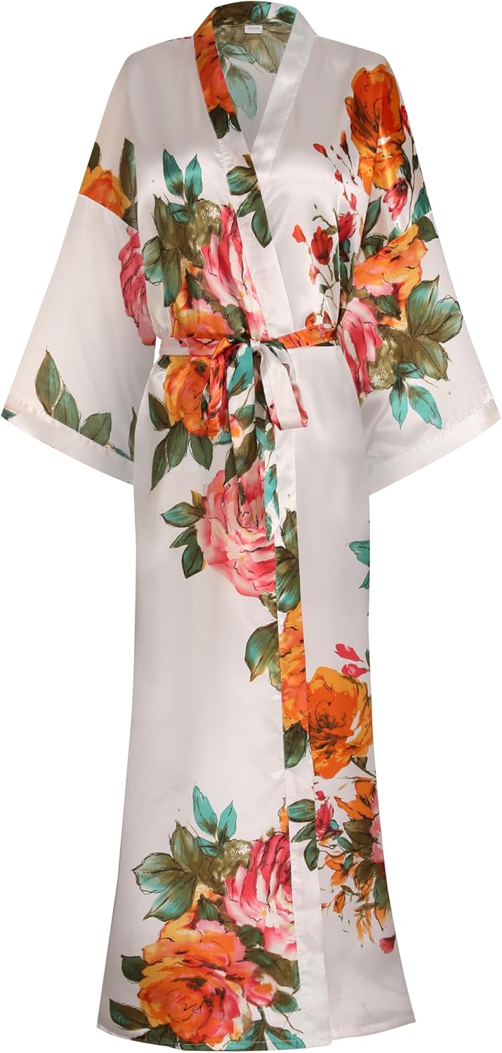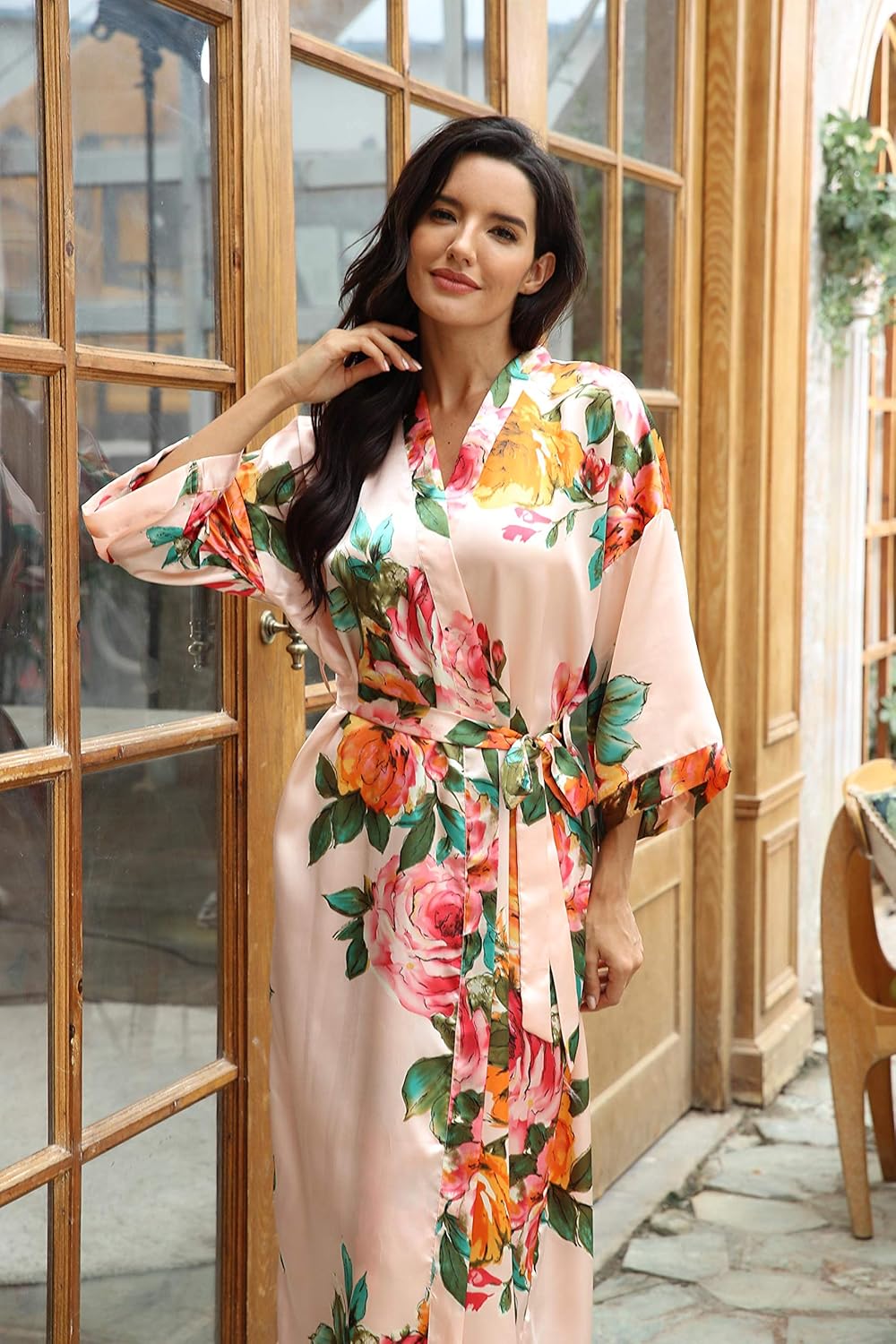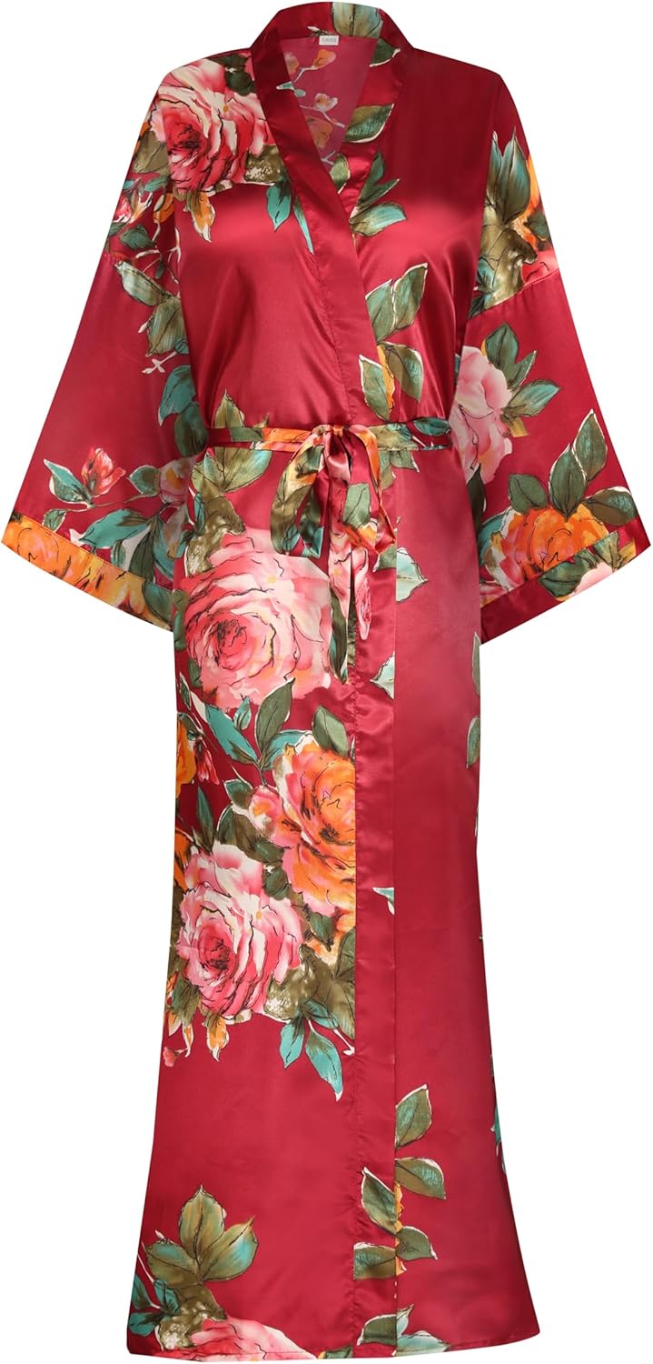 Womens Silk Kimono Robe Long Floral Bridesmaids Robe Satin Wedding Party Bridal Robe Dressing Gown Loungewear Sleepwear