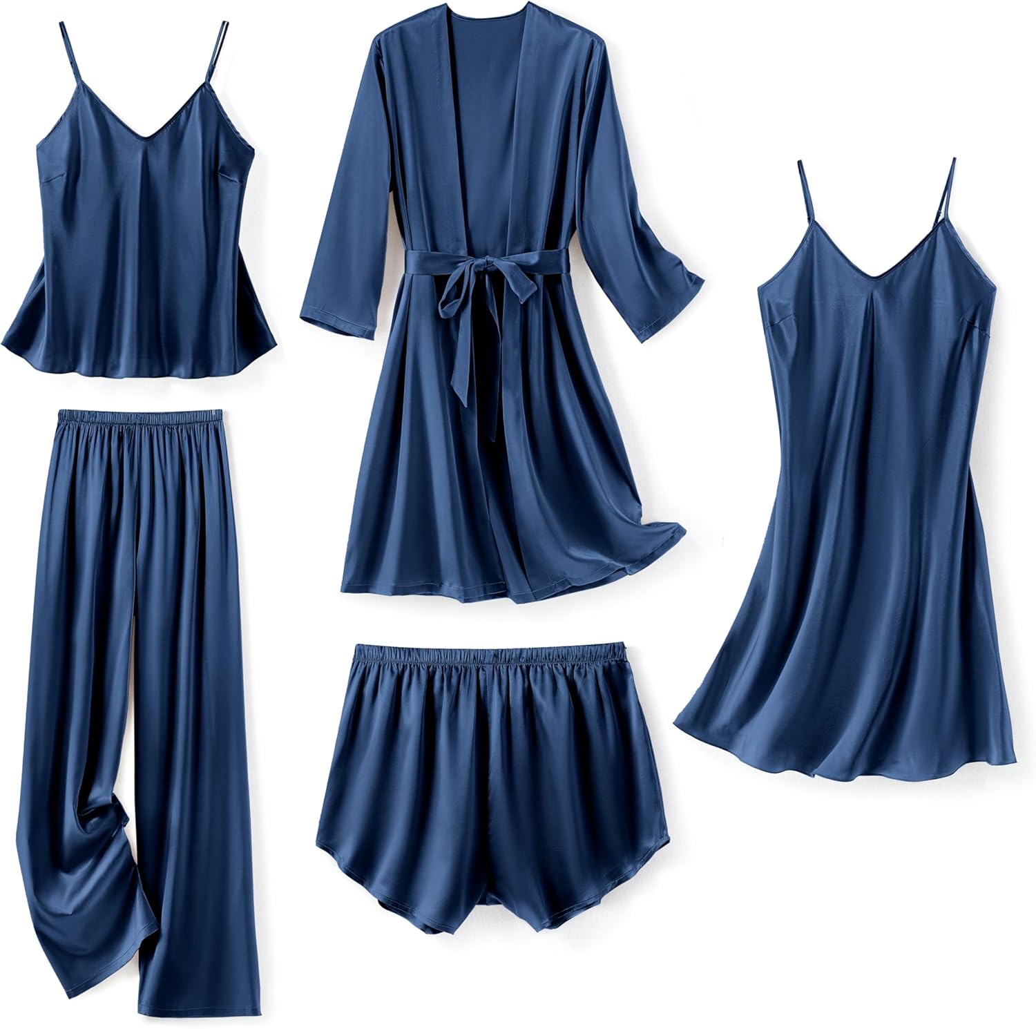 5 Piece comfort satin pajamas women, include sexy nightgown, cami tops, shorts, long pants and silk robe with belt.
