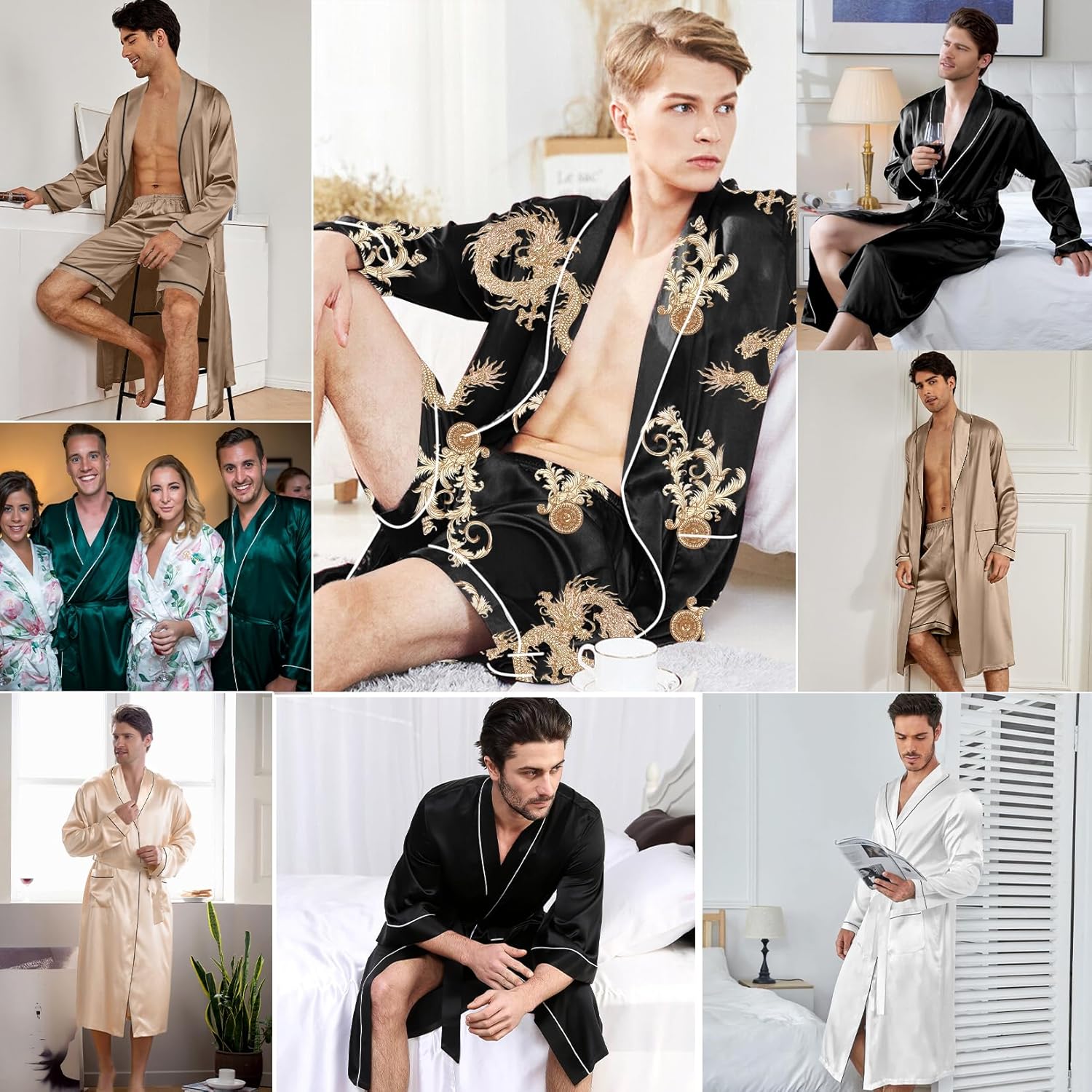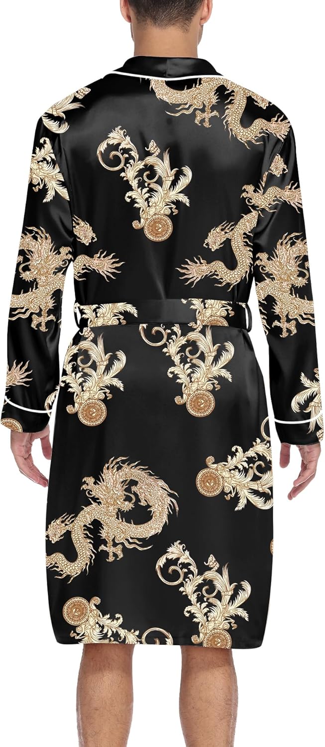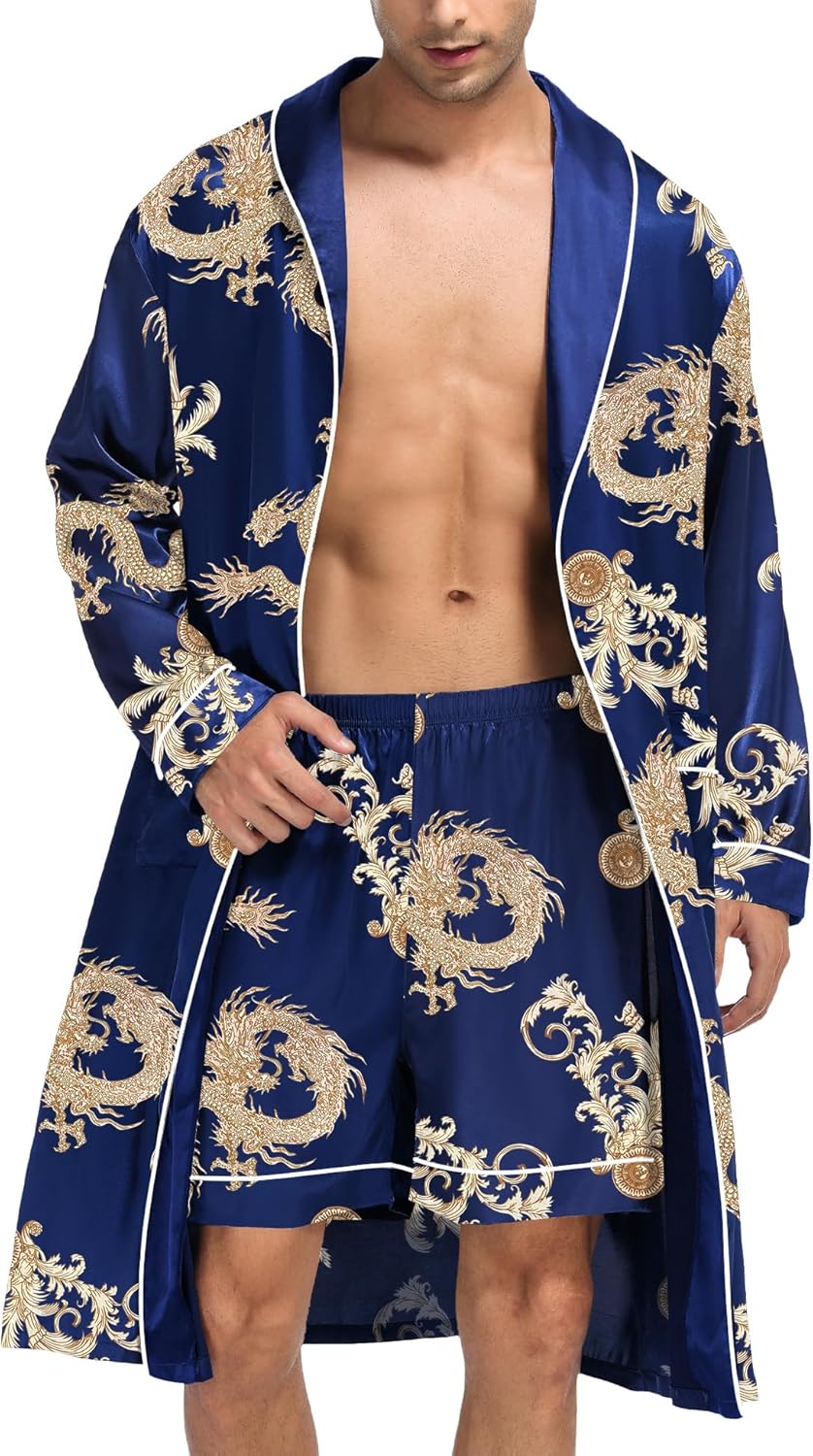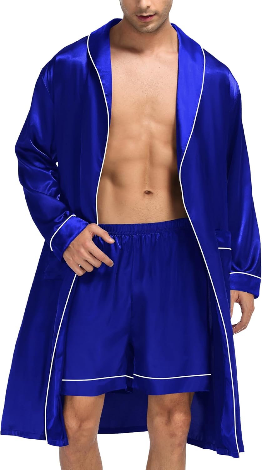 SWOMOG Men’s Satin Robe Silky Kimono Bathrobe with Shorts Set Lightweight Soft Loungewear Nightwear