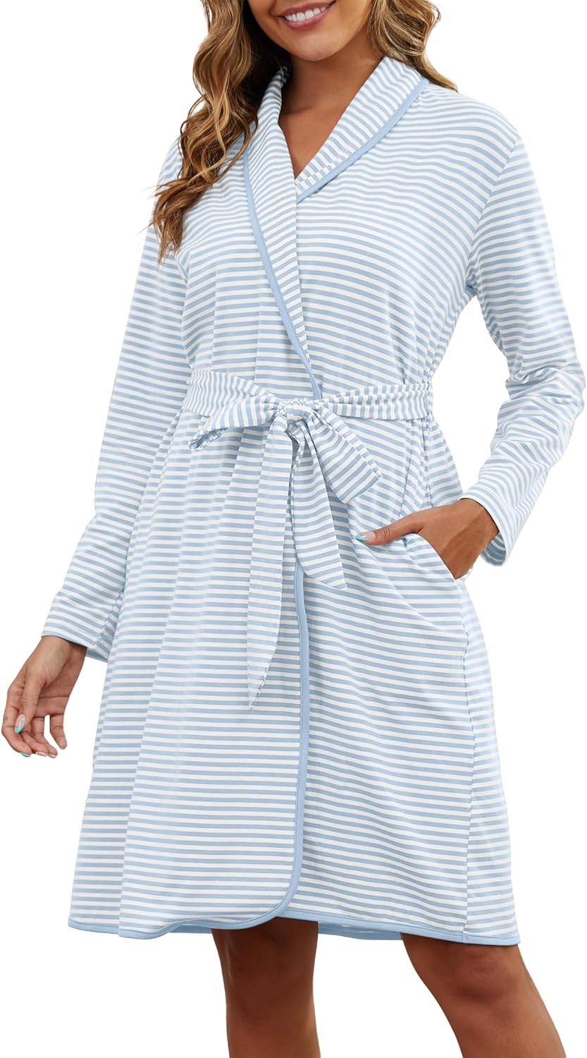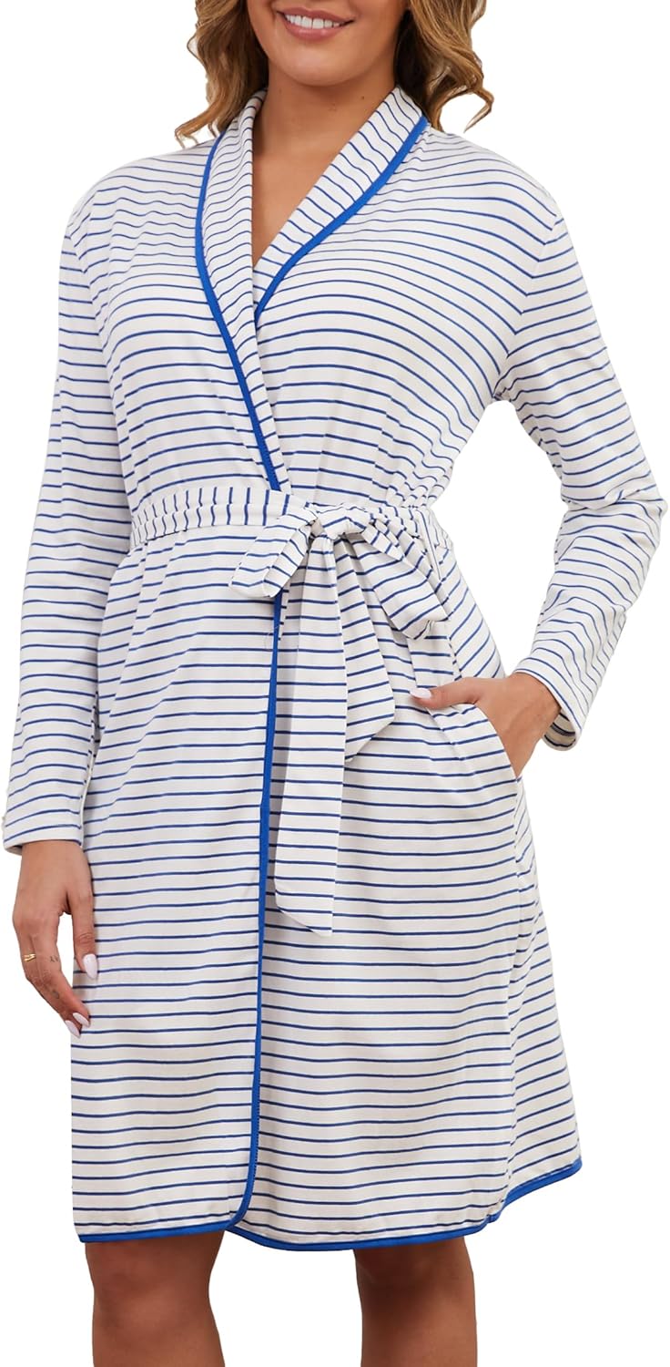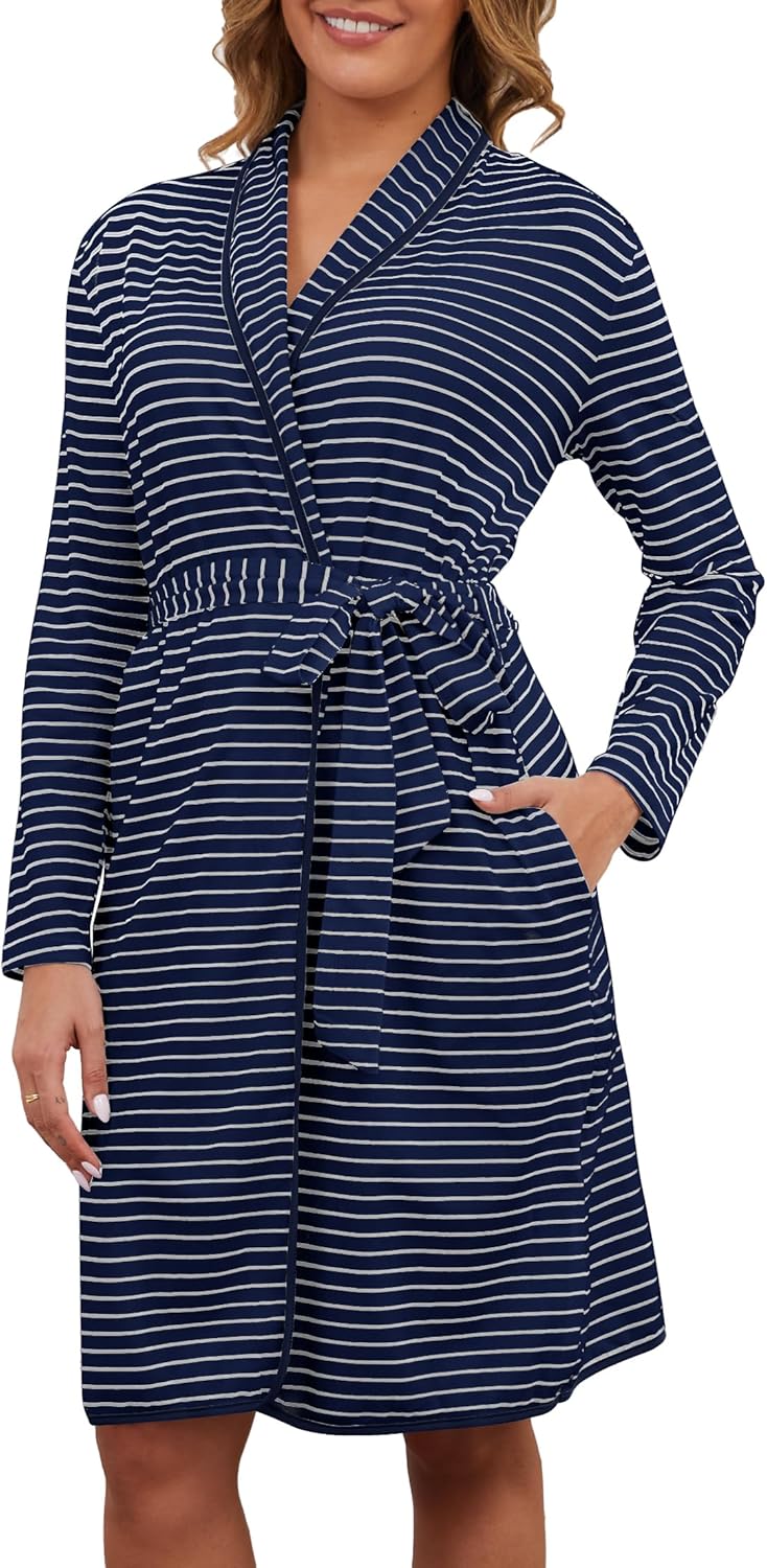 VibeVista Soft Cotton Robes for Women Striped Long Sleeve Kimono Bathrobe House Coats Bath Robe Loungewear with Pockets