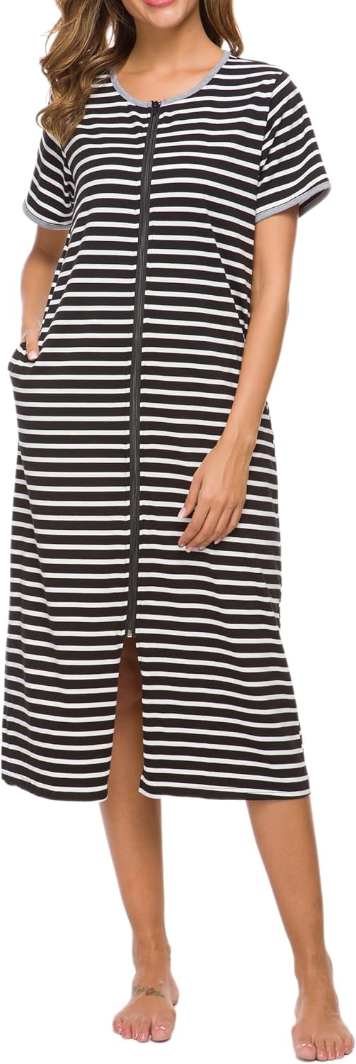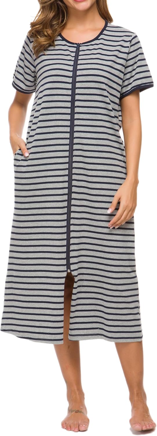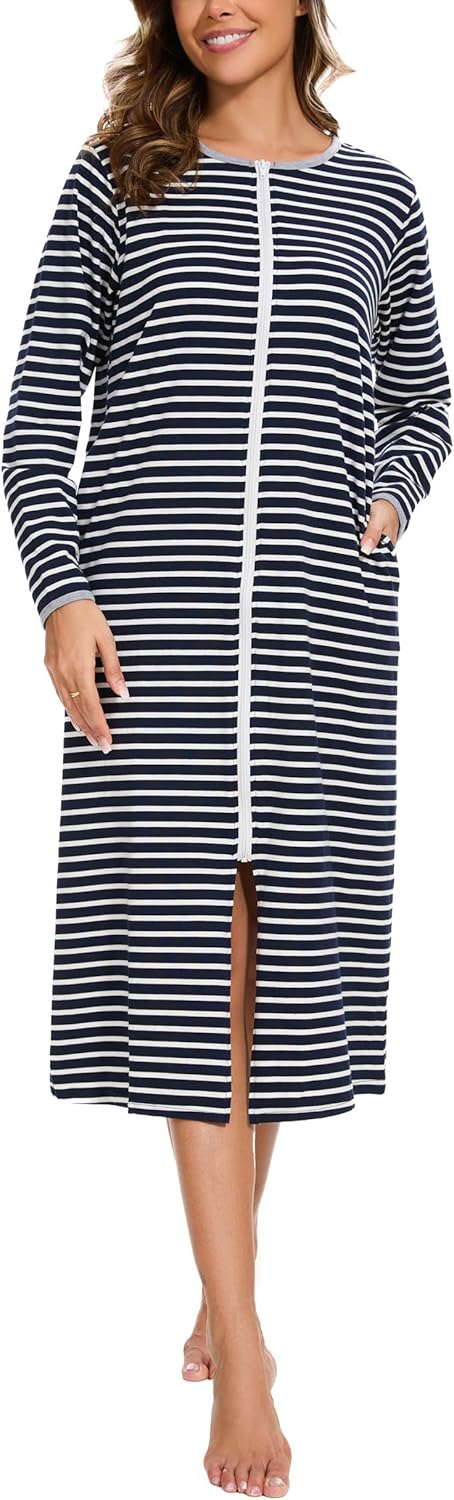 - [Full Length Zipper Front]- With full length zipper front, the women cotton nightgown is easy and convenient to put on and off. Made of premium hardware, the zipper is smooth to slide with no stuck. Zipper design allows you to wear it as a coat or dress.